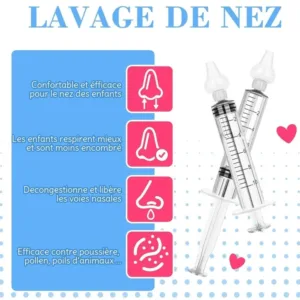 Le lavage de nez bébé avec une seringue remplie de sérum physiologique ou de solution saline est aussi vivement conseillé pour soulager un bébé enrhumé. En effet, cela favorise la fluidification des sécrétions nasales, qui sont évacuées plus facilement.