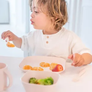 • Composé d’une assiette, d’un bol, d’une cuillère et d’une fourchette flexibles, ainsi que d’un gobelet muni de poignées ergonomiques, chaque élément du set a été conçu avec une approche axée sur l’utilisateur. Les couverts, avec leurs poignées épaisses et surfaces antidérapantes, sont particulièrement adaptés aux petites mains. Ils sont pensés pour aider les jeunes enfants à développer leur autonomie pendant les repas, mais également pour soutenir ceux qui rencontrent des difficultés motrices.